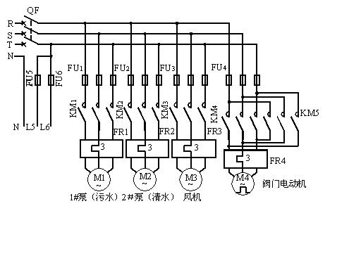 1) 主回路中交流接觸器KM1、KM2、KM3分別控制1#清水泵M1、2#清水泵M2、曝氣風機M3;交流接觸器KM4、KM5控制電動閥電動機M4,通過正、反轉(zhuǎn)完成開起閥門和關(guān)閉閥門的功能。