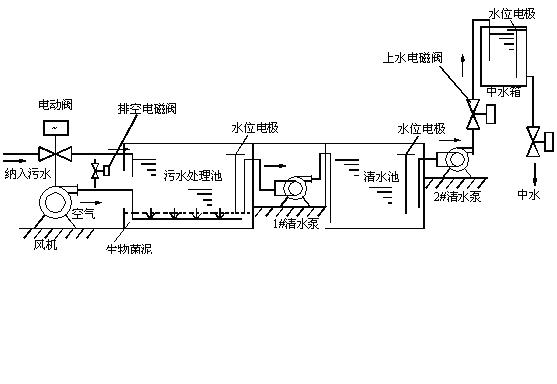 廢水處理系統(tǒng)分別由污水處理池、清水池、中水水箱、電控箱以及水泵、羅茨風機、電動閥門和電磁閥等部分組成,在污水處理池、清水池、中水水箱中分別設(shè)置液位開關(guān),用以檢測水池與水箱中的水位。廢水處理系統(tǒng)示意圖如圖1所示。