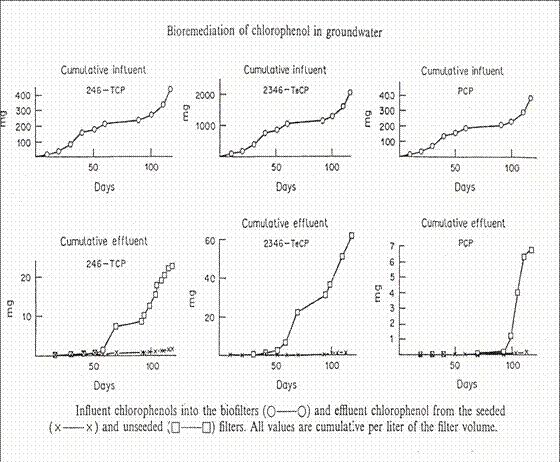 類似的結(jié)果也在被高濃度氯酚(三氯酚,四氯酚,五氯酚)污染的地下水的處理中得到證明。當(dāng)氯酚在LEVAPOR生物膜反應(yīng)器中被完全降解時(shí),其在懸浮污泥中的降解率卻相當(dāng)?shù)停唧w的對比見以下圖表。
