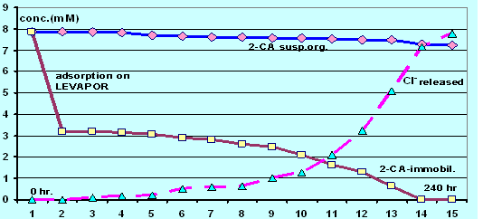 在一個(gè)反應(yīng)池中懸浮的微生物被2-氯苯胺抑制。而在投入LEVAPOR®懸浮填料的另一個(gè)反應(yīng)池中,2-氯苯胺被吸附到填料表面,其在污水中的濃度2個(gè)小時(shí)內(nèi)降低到3.2 mM。通過研究證明10天內(nèi)包括附著在懸浮填料上的部分所有2-氯苯胺被完全降解,以釋放的氯離子的濃度來表示,結(jié)果見下圖。