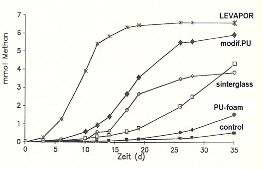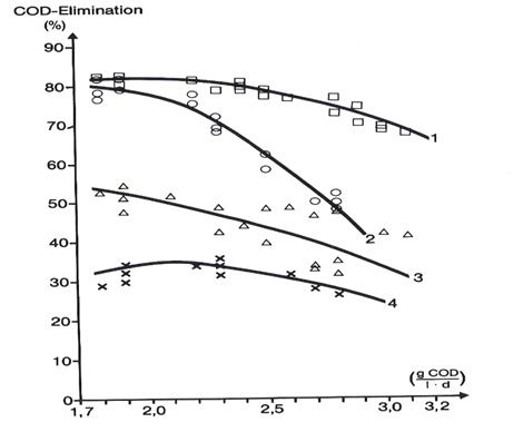 | 紙漿廠漂白污水在不同填料上的厭氧處理 1. LEVAPOR®,2.活性碳,3. 聚氨酯泡沫體,4. 懸浮污泥 |