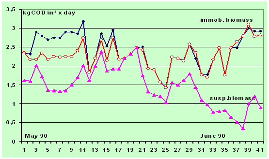 為了定量說明LEVAPOR生物膜工藝的貢獻(xiàn)率在啟動(dòng)階段三個(gè)甲烷反應(yīng)器中只有兩個(gè)反應(yīng)器中投放了LEVAPOR® 懸浮填料。裝有懸浮污泥的反應(yīng)器的運(yùn)行效率明顯比LEVAPOR生物膜反應(yīng)器低,在經(jīng)過第一次毒性沖擊后活性污泥呈不可逆的抑制狀態(tài)。此后該反應(yīng)器也改成了生物膜反應(yīng)器,結(jié)果見下圖。