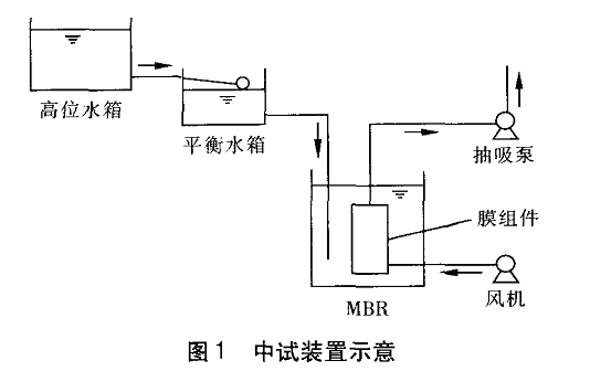廢水由高位水箱經(jīng)平衡水箱進(jìn)人MBR,高位水 箱容積為0.64 ITI 。在反應(yīng)器中污染物經(jīng)微生物降 解后,由抽吸泵將膜濾水抽出。MBR容積為0.4 ITI ,膜組件采用中空纖維濾膜,膜孔徑為0.1~0.4 Ixm,膜通量為0.328 m /(m ·d),運(yùn)行方式為抽吸 12 rain、反沖3 rain。