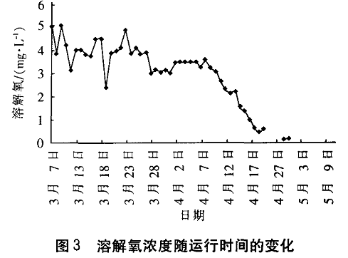 2.2溶解氧濃度隨運(yùn)行時(shí)間的變化在試驗(yàn)開(kāi)始后的2 0 d左右, 溶解氧濃度為4 m g / L左右; 隨后 1 0 d左右, 溶解氧濃度降到3~ 3.5m g / L ; 繼續(xù)運(yùn)行 2 0多天 , 溶解 氧濃度逐漸降到0.5 m g / L左右; 之后, 溶解氧濃度降到0.2 m g / L左右, 反應(yīng)器已處于缺氧狀態(tài),見(jiàn)圖 3 。