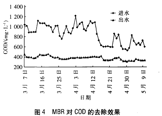 2.4對(duì)C O D的去除效果:MB R對(duì) C O D的去除效果見(jiàn)圖 4 。
