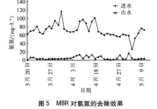 由圖4可知, 進(jìn)水 C O D為4 0 0~ 1 1 0 0 m s /L , 出水 C O D為 1 2 0~ 3 0 0 m g /L 。在試驗(yàn)的最后 2 0多天, 進(jìn)水 C O D濃度較前期低, 為4 0 0~ 7 0 0 m g /L ,出水C O D濃度也較前期低,為 1 2 0~ 2 2 0 mg /L?芍,隨污泥濃度的升高、溶解氧濃度的不斷降低、H R T的逐漸縮短,MB R對(duì) C O D的去除率并沒(méi)有降低,平均去除率保持在 7 3 %,這說(shuō)明高污泥濃度、低溶解氧狀態(tài)下的MB R工藝對(duì) C O D的去除效果仍較好。