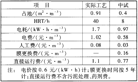 技術(shù)經(jīng)濟(jì)指標(biāo)對(duì)比見(jiàn)表 1 。可知, MB R工藝的占地面積、H R T、運(yùn)行費(fèi)等均小于現(xiàn)場(chǎng)實(shí)際工藝, 技 術(shù)經(jīng)濟(jì)指標(biāo)優(yōu)于現(xiàn)場(chǎng)實(shí)際工藝。