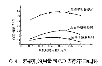 由圖4可見(jiàn),陽(yáng)離子型絮凝劑處理效果最好,最佳投加量為0.5mg/L。因?yàn)榇幚淼某瑸V液廢水中的膠體粒子一般呈負(fù)電性,而陽(yáng)離子型絮凝劑其基團(tuán)離解后帶正電,所以陽(yáng)離子型絮凝劑在混凝過(guò)程中,不僅利用了高分子絮凝劑在混凝過(guò)程中的吸咐-架橋作用,還利用了吸附-電中和作用,故陽(yáng)離子型絮凝劑有更優(yōu)良的混凝效果,其投加量與COD去除率的變化關(guān)系類(lèi)似于混凝劑的投加。