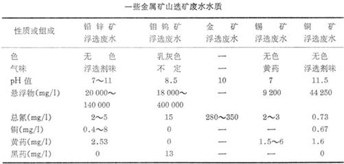 (7)化學(xué)耗氧物:化學(xué)需氧量是水中的耗氧有機(jī)物的量化替代性指標(biāo),在選礦廢水中的耗氧物,主要是殘存于水中的選礦藥劑。一些金屬礦山選礦廢水水質(zhì)如表。