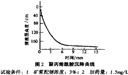 以濃度為300~mg/L的選礦污水為試液(pH=8.12),在室溫下在100mL量筒和直徑40ram,高2m的沉淀管內(nèi)對(duì)聚鐵、聚鋁、聚丙烯酰胺等進(jìn)行篩選試驗(yàn)。從絮凝物的沉降速度和上清液的濁度兩個(gè)方面評(píng)價(jià)各種絮凝劑之間促進(jìn)沉降效果的次序,肯定了陰離子型聚丙烯酰胺對(duì)處理該選礦廢水的沉降效果最好。試驗(yàn)曲線見圖2。