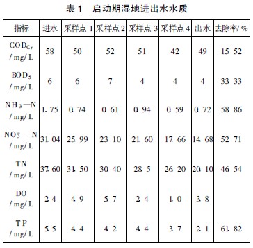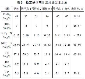于2007 年7 月將流量控制為100 m3 / d, 水力負(fù)荷為0. 16 m/ d。表3 為6 個(gè)月后各項(xiàng)水質(zhì)平均值, 此期間濕地已經(jīng)完全穩(wěn)定運(yùn)行。