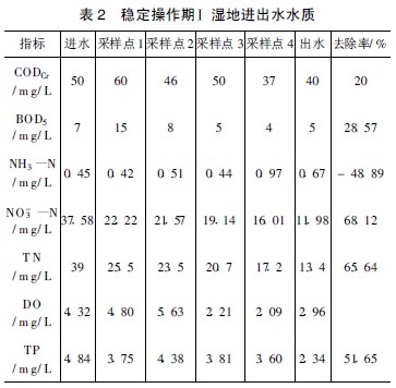 于2007 年3 月將進(jìn)水流量控制為70 m3 / d, 水力負(fù)荷為0. 11 m/ d。表2 為4 個(gè)月后各項(xiàng)水質(zhì)平均值。此期間濕地對污染物的去除效果明顯較啟動期高。例如TP, 經(jīng)人工濕地處理后, 有較明顯的去除效果, 從4. 84 mg/ L 降低至2. 34 mg/ L, 去除率58%。