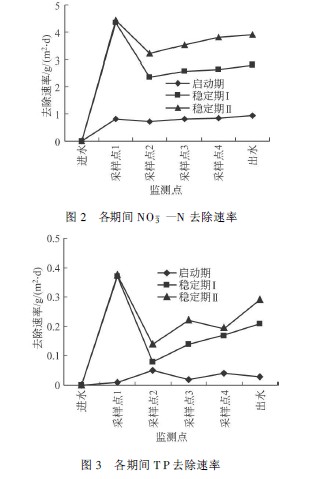 比較啟動期與穩(wěn)定操作期Ⅰ、Ⅱ, 人工濕地對于 NO- 3-N、T P 的去除速率如圖2、圖3 所示。穩(wěn)定操作期的人工濕地中各點(diǎn)去除速率均比啟動期高, 另外值得注意的是在穩(wěn)定操作期, 采樣點(diǎn)①的 NO- 3-N 去除速率遠(yuǎn)高于其他各采樣點(diǎn), 主要原因?yàn)闈竦厝肓鞫蔚啄嘀械南趸芨邼舛萅 O- 3-N 刺激, 硝化活性遠(yuǎn)高于濕地中其他各點(diǎn), 使?jié)竦厝肓鞫蔚腘 O- 3-N 去除比其他各點(diǎn)優(yōu)越; 反之, 在濕地啟動適應(yīng)期階段并無類似的情形發(fā)生, 顯示濕地底泥中的硝化菌同樣處于適應(yīng)期。采樣點(diǎn)①總磷的去除速率也高于其他各采樣點(diǎn), 主要原因是該處放置了水芙蓉等浮水性植物, 在經(jīng)常打撈的情況下, 水芙蓉可持續(xù)增長并攝取水中的磷[ 3, 4] 。