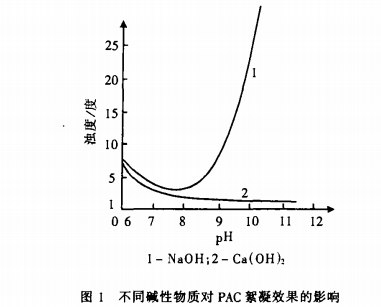 ③若廢水的高pH值是由Ca(OH)2引起的,則在pH=6~12時不影響PAC的絮凝效果。不同堿性物質(zhì)對PAC絮凝效果的影響見圖1。
