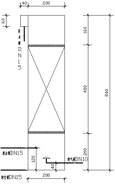 本課題的試驗(yàn)?zāi)P头譃閮深。一為填料篩選模型,二為工況試驗(yàn)?zāi)P汀?BR>首先制作2 個(gè)填料選擇模型,均為柱狀。外接配水箱與高位水箱,采用穿孔管曝氣,兩個(gè)試驗(yàn)?zāi)P凸灿靡慌_風(fēng)機(jī),用流量計(jì)加以控制,通氣量為360 L/h。出水采用淹沒出流。泥種取自污水處理廠二沉池排泥;旌弦何勰酀舛染S持在3500 mg/L 左右。裝置簡圖見圖1,在器壁上貼上標(biāo)尺以便體積讀數(shù)。