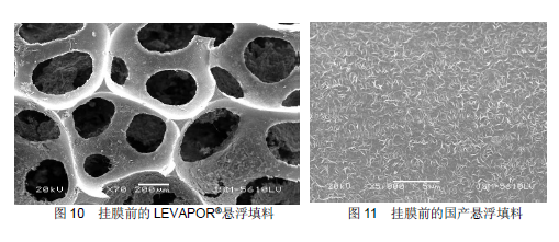 此外還選擇了一家國產(chǎn)的懸浮填料,該產(chǎn)品在國內(nèi)污水處理廠的提標(biāo)改造工程有過成功應(yīng)用,該產(chǎn)品的比表面積在500-600 m2/m3。