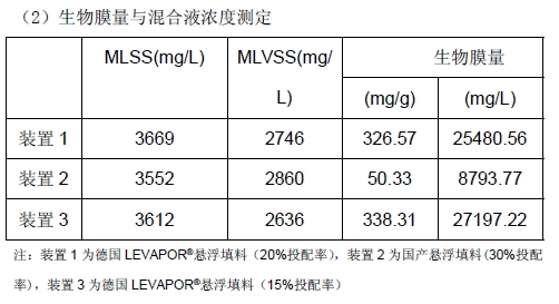 出水指標(biāo)均能達(dá)標(biāo)的前提下做了LEVAPOR®懸浮填料投配率降低為10%的破壞性試驗(yàn),出水水質(zhì)指標(biāo)也能達(dá)標(biāo)。試驗(yàn)中國產(chǎn)懸浮填料始終采用30%的投配率。