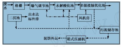 經過多方調查和小試的基礎上,最后選擇水解酸化-多級接觸氧化工藝為主體工藝,工程完工后,進行了3 個多月的調試運行。