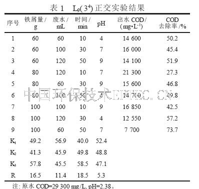 為盡快確定最佳工藝條件和影響處理效率的主要因素, 選取鐵屑質(zhì)量(m) 或廢水體積(V) 、曝氣時間( t) 、pH 等因素, 每一因素各選三個水平套用正交表L9( 34) 進行正交試驗〔8〕, 結(jié)果見表1。