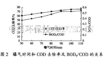 2.2.2 曝氣時間對COD 去除率和可生化性的影響從表1 中的極差分析可知, 處理時間越長COD去除率越高, 為進一步確定最佳處理時間, 又進行了單一因素試驗。在鐵屑質(zhì)量100 g 和廢水體積60 mL條件下, 考察了曝氣時間對處理效果的影響, 結(jié)果見圖2。