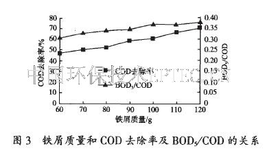 由圖3 可看出, 隨著鐵屑質(zhì)量的增加, COD 去除率增加的幅度較大, 可生化性雖然提高, 但增加幅度較小, 且當鐵屑質(zhì)量> 100 g 時增長速率變緩。況且實際運行時鐵屑質(zhì)量越大, 成本越高, 因此綜合考慮認為選擇100 g 為宜。在實際應用中, 鐵屑可長期使用, 只要保持60mL 廢水用100 g 鐵屑的配比即可。