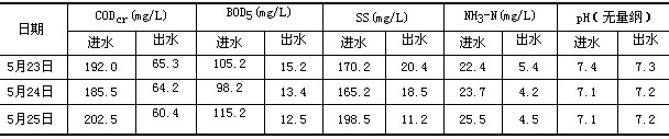 該工程運行初期,因預(yù)處理工段效果尚不明顯,為減少潛流式人工濕地的負荷,采用對預(yù)處理池出水進行回流,以加大預(yù)處理工序的進水,增加對池中填料及污泥的擾動,并3次投加化糞池污泥,以縮短預(yù)處理工序的生化培養(yǎng)時間、增強系統(tǒng)的抗沖擊能力。經(jīng)過25天的培養(yǎng)馴化調(diào)試,預(yù)處理池填料上附著生物膜,出水池中出水有成熟的生物膜脫落,系統(tǒng)進入穩(wěn)定運行階段,出水水質(zhì)達到設(shè)計要求,對COD、BOD5、SS、NH4+-N的平均去除率分別達到67.2%、87.0%、90.4%和80.2%。該工程于2010年4月通過環(huán)保局驗收,并一直穩(wěn)定運行至今,5月23日-5月25日的實際運行數(shù)據(jù)見表2。