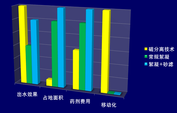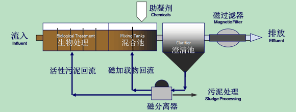 磁加載高濃度活性污泥技術(shù)是在生化曝氣池中投加高效可回收的磁粉,通過高濃度的污泥回流,提高曝氣池的污泥濃度和沉淀池中污泥沉降速度,從而大大提高處理效果和減小了占地面積。