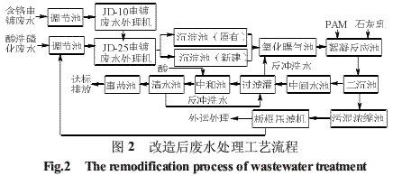 改造后的處理工藝流程如圖2所示。含鉻電鍍廢水經(jīng)調(diào)節(jié)池均勻水質(zhì)后,進(jìn)入JD-10型電鍍廢水處理機(jī)處理,其出水和經(jīng)過(guò)調(diào)節(jié)水質(zhì)后的酸洗磷化廢水一同進(jìn)入JD-25型電鍍廢水處理機(jī)進(jìn)行處理,處理后的廢水進(jìn)入沉淀池進(jìn)行固液分離。廢水在沉淀池停留2 h以后,進(jìn)入曝氣氧化池,停留2.5 h,將出水中殘余的Fe2+氧化為Fe3+后進(jìn)入絮凝反應(yīng)池。在絮凝反應(yīng)池,投加PAM和石灰乳去除廢水中殘留的鐵離子和磷酸鹽。絮凝反應(yīng)池出水進(jìn)入二沉池,廢水在二沉池停留2h后進(jìn)入中間水池。中間水池的廢水 通過(guò)過(guò)濾泵泵入過(guò)濾罐,經(jīng)過(guò)濾后進(jìn)一步去除懸浮物后進(jìn)入到中和水池,加酸調(diào)整pH后進(jìn)入清水池達(dá)標(biāo)排放。