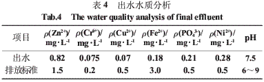 工藝改造完成后,連續(xù)試運(yùn)行90 d,系統(tǒng)運(yùn)行良好,出水穩(wěn)定。檢測(cè)結(jié)果顯示,Cr6+、Fe2+、PO43-、Cu2+等主要污染物的去除效果明顯,各項(xiàng)指標(biāo)均達(dá)到電鍍行業(yè)的污染物排放標(biāo)準(zhǔn)(GB 21900-2008)要求(見(jiàn)表4)。