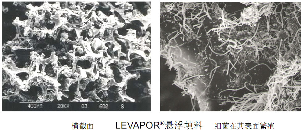 通過(guò)使用 LEVAPOR ® 懸浮填料能對(duì)工業(yè)污水的各類污染物質(zhì)非常有效地去除 。 LEVAPOR ®懸浮填料是有彈性和孔隙的高分子物質(zhì) , 由具有表面活性的顏料例如活性碳加以改性,從而使吸附面積最大能達(dá)到 20.000 m ² /m ³ , 該懸浮填料具有以下特性: