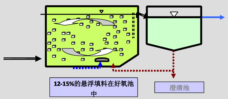 在大多數(shù)情況下使用流化床反應(yīng)器,在反應(yīng)池中投加 12 - 15 % 體積比的LEVAPOR ® 懸浮填料 。 因?yàn)閼腋√盍系拿芏群苄?, 已建設(shè)施的曝氧裝置足以使填料在反應(yīng)池中充分流化起來(lái),因此對(duì)已建設(shè)施的改擴(kuò)建異常方便。在底部曝氣的反應(yīng)池中只需安裝充足的濾網(wǎng)或格柵就能防止填料的流失。