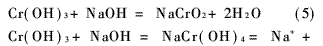 三價(jià)鉻形成Cr(OH)3的pH值下限為5.6。但其為兩性氫氧化物,當(dāng)pH值≥12時(shí)開始復(fù)溶,至15時(shí)完全溶解。復(fù)溶生成亞鉻酸鹽或生成配合物: