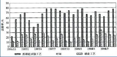 將原12條處理線中的6條改為硝化-反硝化運(yùn)行模式,另外6條仍保持硝化模式。每條處理線由5個(gè)完全混合反應(yīng)器串聯(lián)而成,在第4個(gè)或第5個(gè)反應(yīng)器(根據(jù)季節(jié)調(diào)整)內(nèi)投加純凈的甲醇作為反硝化的補(bǔ)充碳源。工藝的關(guān)鍵是保證前3個(gè)反應(yīng)器內(nèi)實(shí)現(xiàn)硝化,為反硝化提供硝酸鹽。