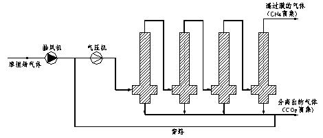 在氣體滲濾過程中混合氣體的分離是根據(jù)不同氣體通過膜的速率各不相同而進(jìn)行的。對于填埋場氣體用傳統(tǒng)的膜材料進(jìn)行分離,氮?dú)夂图淄闅怏w的滲透性較差,而二氧化碳、氧氣、硫化氫和水蒸氣的滲透性較高。正是因?yàn)椴煌臐B透性,甲烷才能很容易的與二氧化碳分離。使處理后填埋氣體中CH4含量達(dá)到96%左右。