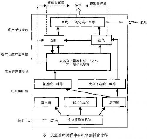 從生物化學(xué)和微生物學(xué)的角度,厭氧生物處理過程中有機(jī)物(尤其是復(fù)雜有機(jī)物——在廢水中以懸浮物或膠體形態(tài)存在的高分子有機(jī)物)的降解途徑可分為水解、發(fā)酵產(chǎn)酸、產(chǎn)乙酸產(chǎn)氫和產(chǎn)甲烷四個(gè)階段(如下圖)。