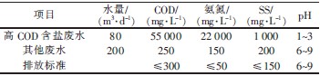 該企業(yè)的廢水種類復(fù)雜,成分多,其高濃度有機(jī)含鹽廢水為間歇排水,不僅含有生產(chǎn)中使用的有機(jī)溶劑,還含有生產(chǎn)過程中添加的酸、堿、鹽等,水質(zhì)變化較大。根據(jù)廢水水質(zhì)的特點(diǎn),將全廠生產(chǎn)廢水分流為高COD 含鹽廢水和其他廢水兩大類,分別用兩根排水管道排至廢水處理站。該廢水處理工程的設(shè)計(jì)處理量分別為:高COD 含鹽廢水80 m3/d,其他工藝及廠區(qū)生活污水200 m3/d。廢水分類、水質(zhì)、水量情況及排放標(biāo)準(zhǔn)見表1。