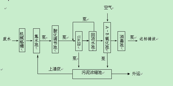 流程說明:來自廠區(qū)的生產(chǎn)廢水及生活污水經(jīng)管道收集流經(jīng)格柵去除顆粒雜物后,排入集水調(diào)節(jié)池,然后由廢水提升泵送至廢水予酸化池,池中設(shè)潛水?dāng)嚢铏C(jī)進(jìn)行攪拌,在池內(nèi)經(jīng)予酸化過程后,其水質(zhì)保持相對(duì)的穩(wěn),20m3/d的酸化調(diào)節(jié)池出水由泵提升至UASB反應(yīng)器進(jìn)行厭氧消化,維持反應(yīng)器中水溫在240C以上,PH在6~8.5左右,采用池底均勻布水方式使物料與厭氧顆粒污泥得以充分接觸,經(jīng)三相分離器分離后的厭氧消化液進(jìn)入回流水池后,部分與未經(jīng)UASB處理的予酸化出水混合后回流至UASB,部分排入A-B反應(yīng)池進(jìn)行好氧生化處理,上清液排入消毒池,進(jìn)行氯片消毒,達(dá)標(biāo)外排。UASB剩余污泥排到污泥貯池貯存,上清液回流至集水池。A-B池產(chǎn)生的剩余污泥定期排到污泥濃縮池,濃縮后污泥外運(yùn)。