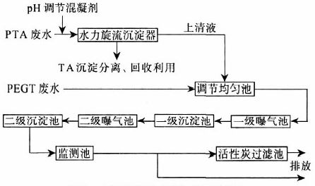 該化纖廠采用“二級曝氣—活性炭吸附”工藝處理PTA和PEGT(聚對苯二甲酸乙二醇酯)混合廢水,具體處理工藝見下圖。