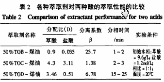 以草酸的分配比及草酸與鹽酸的分離系數(shù)為衡量標(biāo)準(zhǔn),進(jìn)行了萃取劑篩選試驗(yàn),其結(jié)果如表2所示。