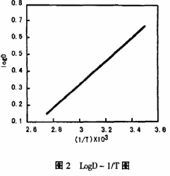 溫度是萃取過程不可忽略的重要因素,在不同的萃取溫度下,相比為1:1條件下,12g/L草酸溶液和由50%TOB+45%煤油+5%2-乙基己醇組成的有機(jī)相進(jìn)行了萃取平衡實(shí)驗(yàn),其試驗(yàn)結(jié)果如圖1所示。從圖1中可以看出,隨著溫度的升高分配比下降,溫度降低雖然分配比較大,但分相時間較長。因而萃取溫度應(yīng)為20℃-30℃較合適,將分配比的對數(shù)值對溫度的倒數(shù)1/T作圖,我們可得到如圖2所示結(jié)果。