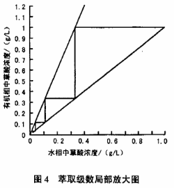 首先根據(jù)實(shí)驗(yàn)數(shù)據(jù)繪出萃取等溫線y=f(x),y表示有機(jī)相中草酸的濃度,x表示水相中草酸的濃度,其次根據(jù)已知被萃草酸在萃余液中的濃度和相比可繪出操作線,在此兩直線之間作折線,結(jié)果如圖3所示,萃取級數(shù)的局部放大圖如圖4所示。具體參見http://wlmqsb.com更多相關(guān)技術(shù)文檔。