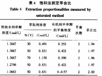 用飽和法研究萃合物的組成,是基于被萃物在有機(jī)相中達(dá)到最大限度的飽和值,以確定萃取劑與被萃物的分子數(shù)的比值,即為萃合物的組成。實(shí)驗(yàn)方法:將不同濃度的萃取劑與不同濃度的草酸溶液平衡數(shù)次(2-3次),使其達(dá)到平衡,分析有機(jī)相的組成,計(jì)算萃合比。在溫度25℃,相比1:1條件下的實(shí)驗(yàn)研究結(jié)果如表4所示。