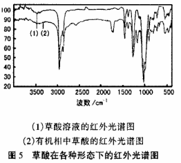 紅外吸收光譜研究萃取機(jī)理目前使用比較廣泛,不同的基團(tuán)在紅外光譜中有不同的頻率,它不僅可以分析化合物的生成,而且可以確定鍵的性質(zhì),為了揭示草酸與有機(jī)相的作用機(jī)理,利用紅外光譜測試研究了水溶液中和有機(jī)相中的草酸紅外光譜圖譜的變化規(guī)律。紅外光譜測定結(jié)果如圖5所示。