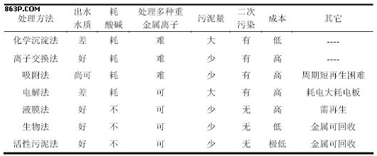 表1-1 電鍍廢水處理方法的比較