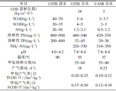 在高溫(55 ℃)條件下進(jìn)行CSTR 的快速啟動(dòng)。CSTR 采用低負(fù)荷啟動(dòng),經(jīng)過(guò)80 d 左右的穩(wěn)定運(yùn)行,COD 容積負(fù)荷達(dá)到了14 kg/(m3·d)。在37 ℃的中溫條件下進(jìn)行UASB 的低負(fù)荷啟動(dòng),經(jīng)過(guò)30 d 左右UASB 運(yùn)行穩(wěn)定,運(yùn)行期間進(jìn)水COD 容積負(fù)荷一直穩(wěn)定在3 kg/(m3·d)左右。啟動(dòng)及運(yùn)行過(guò)程中,沒(méi)有對(duì)兩級(jí)厭氧系統(tǒng)的pH 進(jìn)行人為調(diào)節(jié)和控制。兩級(jí)厭氧反應(yīng)器穩(wěn)定運(yùn)行后的實(shí)驗(yàn)結(jié)果見(jiàn)表2。