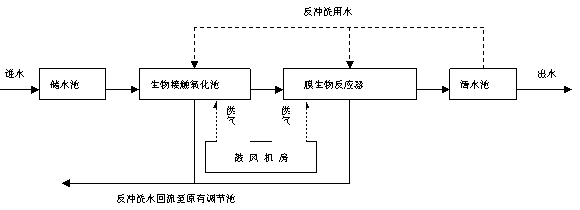 因污水處理站外排水為間斷性排水,為保持后續(xù)處理的連續(xù)性,要建一個(gè)儲(chǔ)水池,儲(chǔ)水池水經(jīng)水泵提升進(jìn)入曝氣生物濾池,在此進(jìn)行進(jìn)一步的生物處理,曝氣生物濾池出水進(jìn)入高效精密過(guò)濾設(shè)備,濾后水進(jìn)入清水池儲(chǔ)存待用。其工藝流程圖如圖1所示: