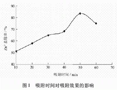 從圖1可以看出,隨著吸附時間的增加,Zn2+的去除率逐漸增大,吸附時間為50min時吸附效果最好,Zn2+的去除率達到83.5%,Zn2+的剩余濃度為1.29mg/L。吸附時間過短,反應不充分,處理效果不佳;吸附時間過長,出現(xiàn)解吸速率大于吸附的現(xiàn)象。后續(xù)試驗吸附時間為50min。