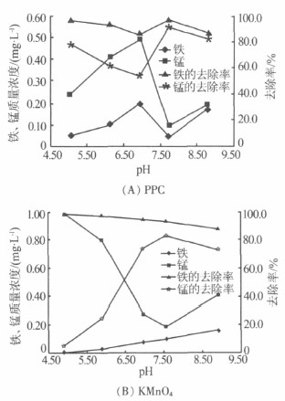 因此,在原水pH為7.14~7.72的范圍內(nèi)使用PPC及KMnO4預(yù)氧化強化混凝均能取得較好的鐵、錳去除效果。
