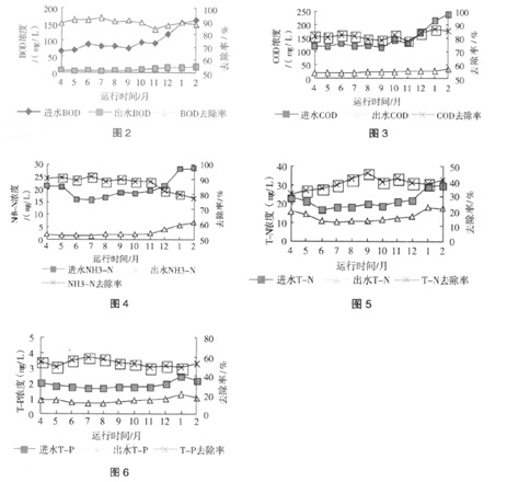 由以上各圖可知該廠的進水水質(zhì)受季節(jié)影響較大,夏季豐水期污染物含量低,冬季枯水期污染物含量都有所升高。COD 和BOD 表現(xiàn)尤為明顯,夏季COD 月平均濃度只有110~120mg/L ,降雨時甚至低于60 mg/L,冬季COD 月平均濃度則可達到240mg/L 左右,最大值可達到360 mg/L 以上。BOD 隨著COD 的變化而變化,全年BOD/COD 值在0.58-0.74 之間?梢娢鬯哂辛己玫目缮,非常適合生物處理。6 月至11 月受用水量和降雨的影響,NH3- N 平均濃度只有15~18 mg/L,而TN 略高于NH3-N 一般在20 mg/L 左右。12 月到次年的2 月在南方是最冷的時候,用水量相對較少而且降雨也少,此時NH3- N 和TN 濃度均可達到30 mg/L。TP 受季節(jié)變化影響較小,月平均濃度在1.6-1.8 mg/L 之間,最高可達到2.5 mg/L 左右。盡管進水水質(zhì)受季節(jié)和降雨的影響較大,但除NH3- N 去除率受氣溫影響而變化較大外,各污染物的去除率均能保持在比較穩(wěn)定的范圍內(nèi)。其根本原因在于AB 工藝的A 段屬于超高負荷活性污泥系統(tǒng),具有很強的耐沖擊能力,可以保護B 段生物處理系統(tǒng)免遭破壞,進而使整個處理系統(tǒng)可以穩(wěn)定高效地運行。由監(jiān)測數(shù)據(jù)表明,該廠的出水水質(zhì)均可達到城填污水綜合排放標準(GB18918-2002)一級B 標準,在夏季污染物濃度較低且氣溫較高的情況下甚至可以達到一級A 標準。