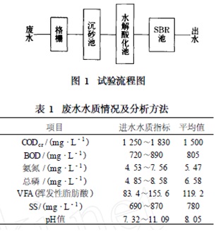 試驗地點為內(nèi)蒙古某乳品廢水處理廠沉砂間內(nèi),直接引接沉砂池初步處理后的出水,水質(zhì)情況及水質(zhì)分析方法見表1,水解池與SBR接種污泥均來自該污水處理廠濃縮池污泥.